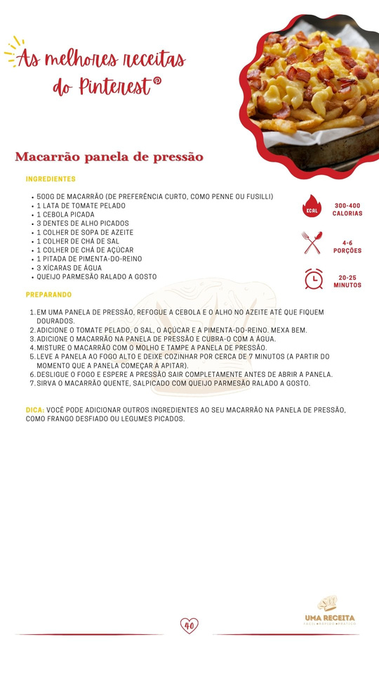 Foram horas de pesquisa para selecionar para você as receitas com maiores números de reações dentro do Pinterest, são 40 RECEITAS saborosas e simples para colocar em prática!